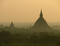 The most tourists I saw were at sunset. Prime viewing temples are shrinking in number, as the upper terraces of the biggest are being closed to the public. Two months ago climbing was prohibited at Minglazedi, so the favourite now is Shwesandaw Paya, a large, solid monument, with steep steps up the outside. I got up there in plenty of time, and looked down as air-conditioned minibuses pulled up at the foot, sending the hawkers into a flurry of activity. I watched contentedly as the sun began to sink, slipping behind a strip of cloud before it hit the mountains on the horizon. I saw this as a blessing in disguise, as I had four kilometres to cycle home. I climbed down and set off, returning just after dark, with a feeling that I'd had a perfect day.
