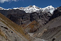 We left at 07:30, and I first got off to a head start . . . then dawdled behind getting my fill of pictures. For me today was the best day yet, scenery-wise. Stark scenery that made me feel the size of an ant. Walking uphill was still a struggle, but no worse than yesterday - better if anything. Had a cup of tea at a stunning rest stop, after a tricky bit zigzagging down to a bridge across a river, then back up the steep bank on the other side. The views were just wonderful. And an extra bonus, when we got into base camp I got a room with a socket - more free leccy, yey! (Filthy sheets mind, and the tablecloth in the restaurant was even worse - well minging.) I guess if this is my last day on earth, it's been a bloody good one!
